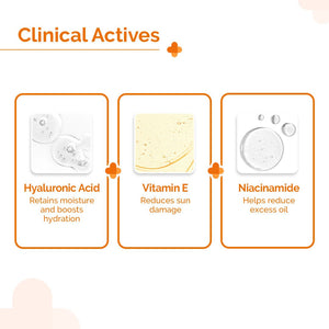 Hyaluronic Acid for hydration, Vitamin E for antioxidant protection, and Titanium Dioxide for broad-spectrum UV defense.